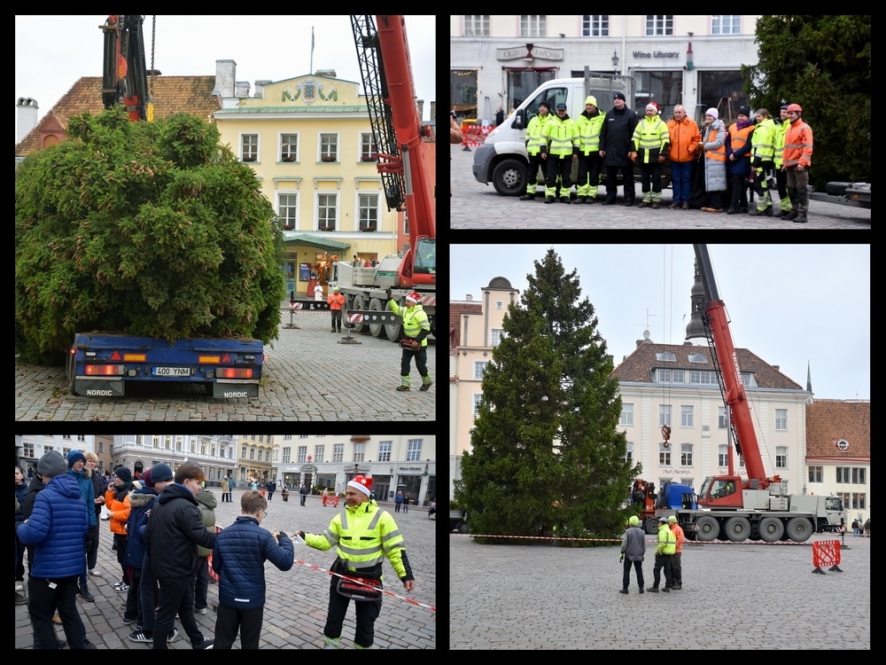 Kollaaž: Jõulukuuse püstitamine Tallinna Raekoja platsile (fotod: MuusikaPlaneet)